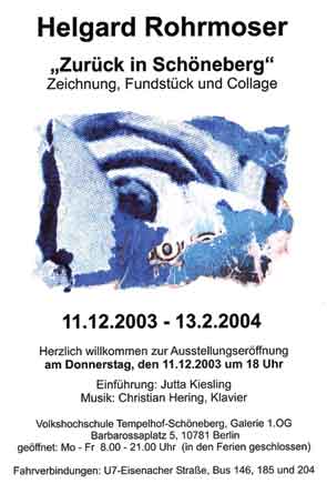 Rohrmoser:"Zurück in Schöneberg" Am Donnerstag, 11. Dezember 2003, 18 Uhr lädt die VHS Tempelhof-Schöneberg zur Eröffnung ihrer neuen Ausstellung ein. Gezeigt werden Zeichnungen, Fundstücke und Collagen von Helgard Rohrmoser, die im letzten Jahr-zehnt entstanden sind. Der gestalterische Ausgangspunkt der Arbeiten ist immer das gesammelte Material, z.B. die Farben einzelner Papierfetzen, die Strukturen eines bedruckten oder beschriebenen Papiers, die zeichnerisch oder malerisch weitergeführt werden. Die Ausstellung ist bis zum 13.02.2004 montags bis freitags von 8-21 Uhr in der Galerie des Hauses am Barbarossaplatz zu sehen. |