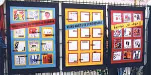 Im Rahmen des Stadtteilprojektes "Kiezplakat" zur Auseinandersetzung mit Gewalt im Schöneberger Norden gab es 2001/02 über 1000 Einsendungen, in denen Jugendliche aus dem Bezirk ihre ganz persönliche Sicht und ihre eigenen Gewalt-Erlebnisse in Schrift und Bild zum Ausdruck gebracht haben. In Ergänzung der Ausstellung "Krieg ist kein Kinderspiel" in der VHS Tem-pelhof-Schöneberg werden jetzt noch einmal die prämierten Plakate und rund 50 Entwürfe zu den Themen Gewalt, Angst, Krieg gezeigt. In einem Themenpodium am Donnerstag, 20.11.2003, 19 Uhr, wird die "Kiezplakat"-Aktion in der Volkshochschule von Vertreter/innen des Projektes vorgestellt und diskutiert. Unter dem Titel "Gewalt und Konflikte vor der Haustür" werden Handlungsmöglichkeiten für den Alltag aufgezeigt und wird die Frage diskutiert, welche weiteren Aktionen möglich wären, um Gewalt im Stadtteil entgegenzutreten und eine andere Streitkultur zu entwerfen. |