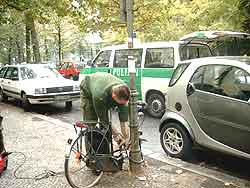 Fußgängerschutzgittern angeschlossen. (-rest) zeigt, schwer zu knacken. Zwar hat ein Großteil dieser Fahrradgerippe den Zenit der eigenen Fahrtüchtigkeit bereits vor etlichen Jahren überschritten, die Halter hielt dies jedoch nicht davon ab, die Rahmen gut zu sichern. Die vier an dem Einsatz beteiligten Polizisten merken, dass ein Weiterkommen ohne den Trennschleifer nicht mehr möglich ist. Die Räder werden registriert und gelegentlich auf Diebstahlmeldungen überprüft. Anschließend werden sie auf den LKW geladen und bei der BSR entsorgt. Die Räder selbst wurden in vorangegangenen Streifeneinsätzen ermittelt, um zu verhindern, dass alte, aber nicht "herrenlose" Räder mitgenommen werden. Mit dem Ergebnis des Einsatzes ist Herr Butz zufrieden. Ca. 50 Schrotträder wurden an diesem Tag entfernt. Bisher ist solch ein Einsatz in Schöneberg einmalig. Nach den Plänen des Polizeioberkommissars Butz könnten aber ähnliche Einsätze in der Zukunft folgen. Sabastina Gülde |