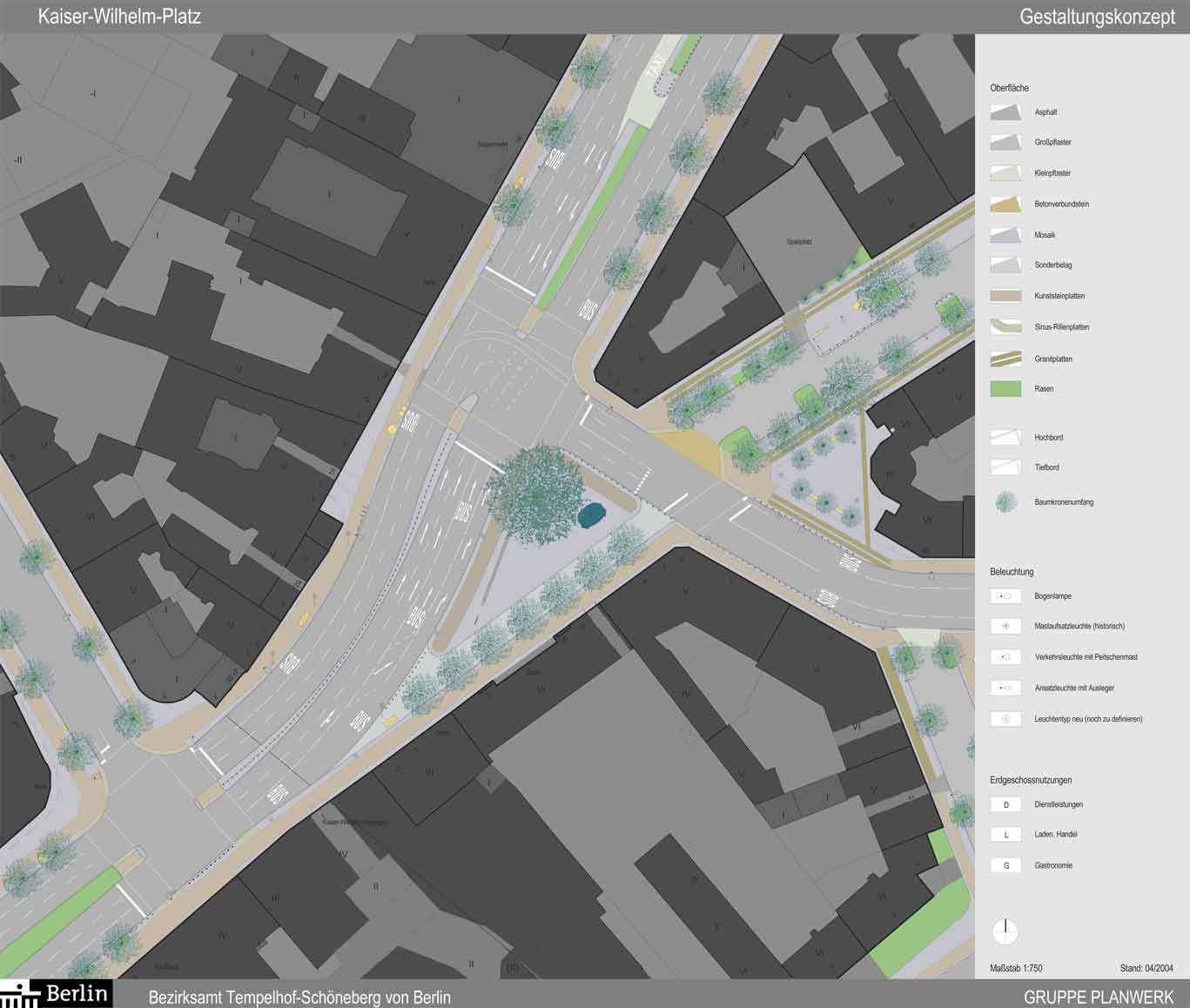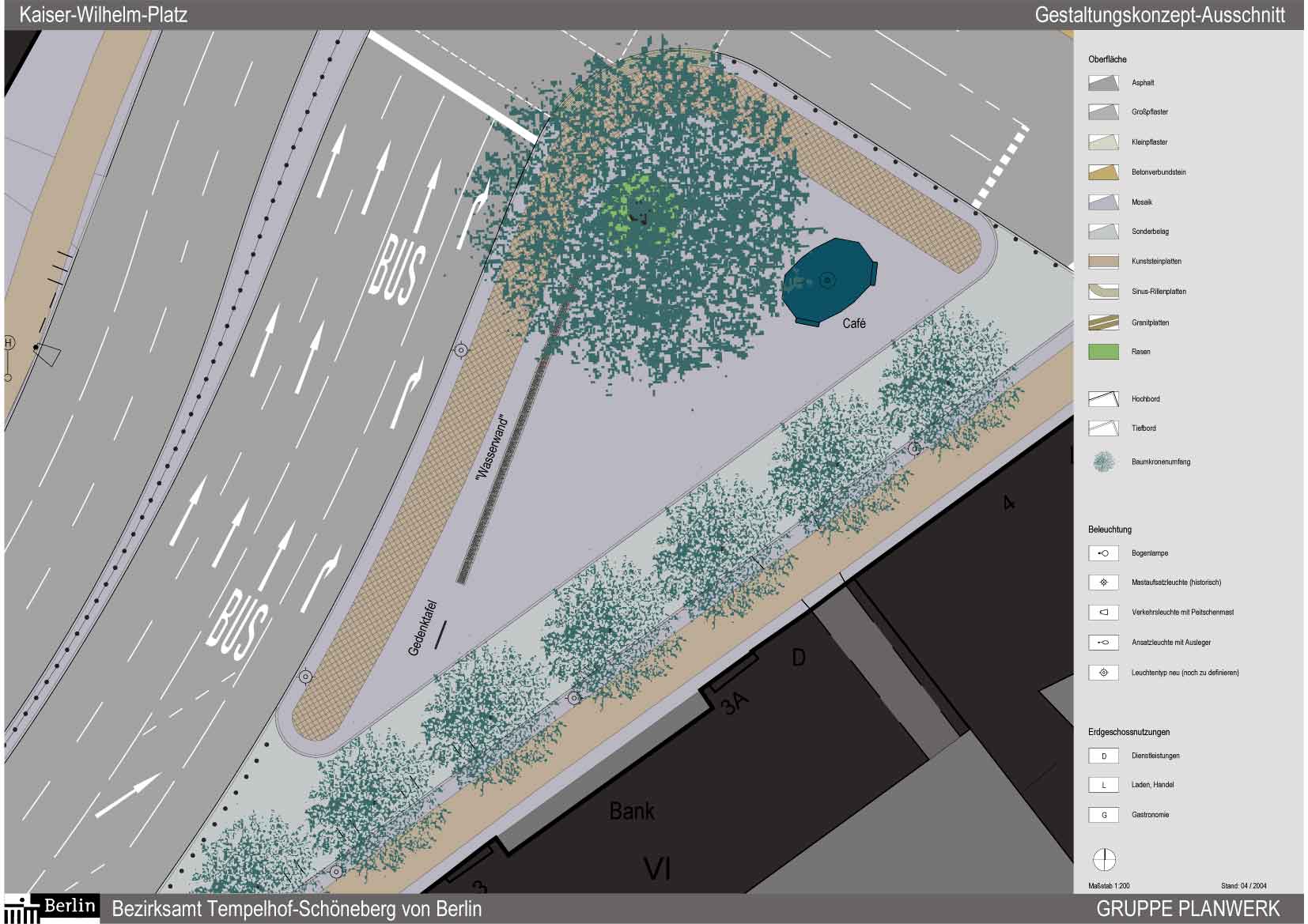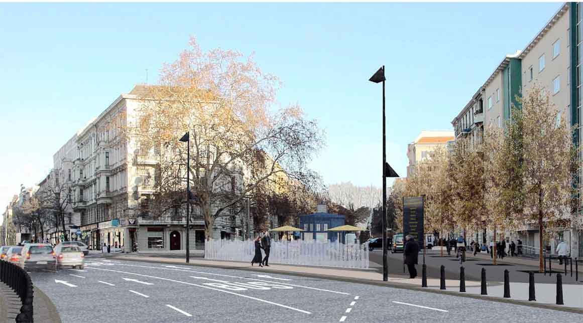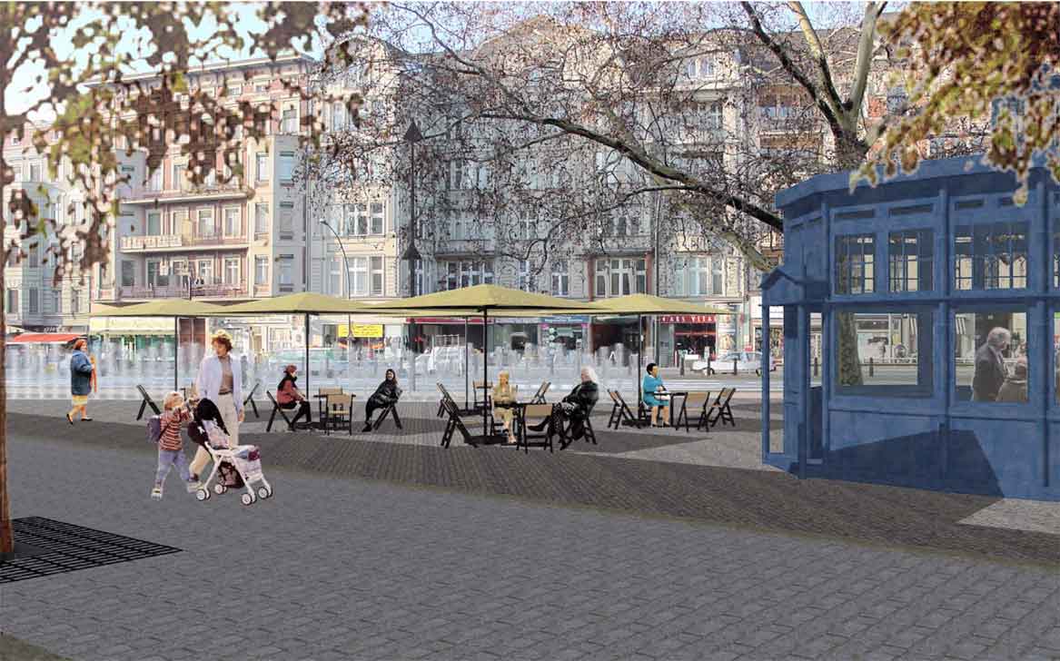 Die Pläne sehen vor, die Südfahrbahn, die in der Weiterführung in die Crellestraße mündet, aufzugeben (1). Der ehemalige Bürgersteig wird angebordert, um das Straßenniveau dem des Platzes angleichen zu können. Die Absperrung erfolgt mit Pollern (2). Vorbaulich wird eine Baumreihe gepflanzt (1). Eine „Wasserwand“ soll den Verkehrslärm der Hauptstraße dämpfen (3). Die Platane bedarf einer gründlichen Wurzelbehandlung, um ihren Bestand halten zu können (4). Gegenüber der Crellestraße soll das alte gusseiserne Pissoir aufgestellt werden, das heute ein Schattendasein an der Bülowstraße fristet (5). Umgebaut soll es als Café 12-Eck im Café- und Kioskbetrieb zum Verweilen einladen. Die Gedenktafel auf der südlichen Spitze des Platzes soll neu ausgerichtet werden (6). Wenn alles gut geht, könnte im Frühjahr mit den Bauarbeiten begonnen werden.