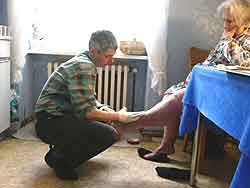 Kompressionsstrümpfe. Einer anderen Patientin muss sie die Beine wickeln