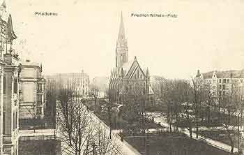 Wagen, im dem das 'Kleinchen' sitzt; die älteren Kinder, die im Sand spielen." (Aus dem "Schöneberg-Friedenauer Lokal-Anzeiger" vom November 1924) Man kann sich das ja gar nicht mehr vorstellen, wie Friedenau zur Zeit seiner Gründung - 1871 - ausgesehen hat: Wiesen und Kornfelder weit und breit, einzelne Wohnhäuser, ein paar Gehöfte, irgendwo ein kleiner Pfuhl. Die von Berlin nach Potsdam führende Chaussee - auf dem späteren Friedenauer Gebiet die Haupt- und Rheinstraße - war allerdings schon seit 1793 gepflastert, sicher zu Heereszwecken. Der Großgrundbesitzer Carstenn, der seine Güter Giesensdorf, Lichterfelde und Deutsch-Wilmersdorf verbinden wollte, ließ 1872-74 die Kaiserstraße (später Kaiserallee, heute Bundesallee) anlegen und mit Rüstern bepflanzen. Diese Straße könnte man als die "Keimzelle" Friedenaus bezeichnen. Ohne alten Siedlungskern wurde Friedenau mitten in den Feldern des Gutes Deutsch-Wilmersdorf auf einem Areal von 40 Morgen angelegt, etwa eine Stunde (Gehminuten, Pferdebahn- oder Bahnminuten?) vom damaligen Mittelpunkt Berlins entfernt - und natürlich weit "vor den Toren Berlins" (ein anderes Dokument nennt eine Entfernung von 4,5 km). Auf einem sog. "Situationsplan von dem Wilmersdorfer Oberfeld" von 1872 sieht man die "Urform" von Friedenau und auch des Friedrich-Wilhelm-Platzes, der wohl als zwei getrennte Anlagen im Zuge der Kaiserstraße geplant war, auf deren einer, der südlichen, später die Kirche zum Guten Hirten errichtet wurde. Mit dieser Straße und ihren Anlagen, die später zum