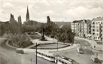 ein Vorgehen von ausgegrenzten Mitbürgern, das man auch heute noch beklagt... Auf einem alten Foto von 1897, von einem Standort mitten in den Feldern (heute Wilhelmshöher- Ecke Rheingaustraße) aus aufgenommen, sieht man, daß die westliche Seite des Friedrich-Wilhelm-Platz noch unbebaut war und sich auf der östlichen Seite außer der völlig freistehenden Kirche nur zwei oder drei Wohnhäuser befanden, schon vierstöckig. Zu der Zeit war der Friedrich-Wilhelm-Platz also eher die westliche Grenze Friedenaus als sein Herz. Aber die Straßen waren projektiert, wenn auch vorerst zwischen Ring-, Handjery- und Rheinstraße bebaut - die ersten Häuser entstanden in der Ring-, heutigen Dickhardtstraße. Das waren noch die ursprünglichen Landhäuser, zuerst verputzt, später mit Backsteinfassaden gebaut. Am ehesten kann man sich ins alte Friedenau hineinversetzen, wenn man vom Friedrich-Wilhelm-Platz aus die Schmargendorfer Straße entlanggeht, in der sich noch eine Reihe von alten Friedenauer Villen findet, vorbei an der sog. Villa Hoffmann an der Ecke des Platzes, die der Bauherr wie eine kleine Ritterburg gestaltet hat. (1979 baute man sie zu einem Jugendzentrum um, das folgerichtig "Die Burg" getauft wurde.) Das Pendant dazu liegt jenseits des Platzes an der Ecke Goßlerstraße, auch von Hoffmann erbaut. Seine Tochter soll noch als alte Dame dort gewohnt haben. Nach Änderung der Bauordnung wurden dann nach und nach auch die Westseite des Friedrich-Wilhelm-Platz und die angrenzenden Straßen bebaut. An der Ecke Kaiser-(Bundes)allee/Goßlerstraße entstand das neue Gemeindehaus in der Form, wie wir sie auch heute kennen, mit Kindergarten und Diakonissenheim, und auch die Baulücken auf dieser Seite der Kaiserallee wurden nach und nach geschlossen. 1901 wurde auf dem nördlichen Ende des Friedrich-Wilhelm-Platz als besonderes "Schmuckstuck" ein Sandsteinbrunnen mit Spenden von Friedenauer Bürgern gebaut und im Oktober 1901 mit vaterländischem Pomp eröffnet, der sog. Kaiser-Wilhelm-Brunnen, auf dem die Kinder mehrerer Generationen herumkletterten. (Sein Abriß in 60ern ging eher sang- und klanglos vonstatten). Im Heimatmuseum Schöneberg befinden sich noch einige Relikte: ein rotes Sandsteinrelief mit Löwenkopf und das Friedenauer Friedensengelwappen auf einer Halbsäule. Nach und nach wuchs der Friedrich-Wilhelm-Platz zu einer schön gestalteten Anlage heran; mit hohen Bäumen und Blumenrabatten wurde er einer der Friedenauer "Schmuckplätze", von denen das Zitat aus dem Lokal-Anzeiger von 1924 spricht. Ich selbst bin in den frühen Dreißigern mit einem Sandeimerchen in der Hand als "Eisverkäuferin" um den Buddelkasten herumgelaufen und erinnere mich an den schönen großen Platz mit Blumen und Bäumen, überspannt von einem hohen Sommerhimmel, über den Flugzeuge zogen, an die gelbblauen Bänke, wo meine Mutter saß und auf mich aufpaßte. Später dann saß ich dort und paßte auf meine eigenen Kinder auf, und der Platz war immer noch schön - nach einer Kartoffel- und Gemüsephase in der Nachkriegszeit wieder mit Blumen bepflanzt, und man konnte dann dort auch nicht mehr seinen überfahrenen Dackel samt Körbchen und Kissen begraben, was die Verfasserin hiermit gesteht, im Frühjahr 45 getan zu haben.. Bis in die 60er Jahre hinein umrundeten die Straßenbahnen wie eh und je den Platz auf ihrer Fahrt vom Zoo nach Steglitz und zurück - anfangs als Dampf-, ab 1898 als elektrische Straßenbahnen. Dann wurden die Schienen ausgebaut, und Busse übernahmen ihre Aufgabe. Den endgültigen Garaus aber machte der "autogerechte" Ausbau dem Friedrich-Wilhelm-Platz. Wegschaffen konnte man ihn nicht, da war die Kirche vor; so hat man ihn zusammengestutzt, hat einen Teil der Anlagen auf der östlichen Seite in zwei weitere Fahrbahnen verwandelt, auf denen die Autos in beiden Richtungen ihren Weg nehmen. Für die Kinder wurde ein Eckchen mit Sandkasten und vergittertem Ballplatz reserviert, der heute kaum noch benutzt wird. Kleine Fontänen sprudelten aus mehreren Kunststeinplatten, die einen recht hübschen Eindruck machten, ehe der immer weniger angenommene Platz zu verwahrlosen begann. Und damit änderte sich auch sein Publikum: schuleschwänzende Jugendliche findet man auf den wenigen Bänken, und diejenigen, denen der Platz zum Wohnzimmerersatz geworden ist und die dort Notgemeinschaften bilden, aus denen sie menschliche Wärme ziehen. Der Platz ist zu einer Durchgangsstation geworden. Umsteigende Fahrgäste und pausierende Busfahrer, die dort ihre Endhaltestellen haben, laben sich an der Imbißbude, ehe sie ihn wieder verlassen. Mehr als einen flüchtigen Blick in verwildertes Grün wirft man dem Friedrich-Wilhelm-Platz heute nicht mehr zu. ©Sigrid Wiegand November 2004 Stadtteilzeitung < Inhaltsverzeichnis |