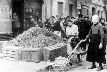 Im Sommer 43 war Inge mit ihrer Mutter und ihrem kleinen Bruder zu Verwandten nach Masuren gefahren. Zu essen gab es dort genug, und wenn sie am Wochenende aus ihrer Schülerpension in Lyck, wo sie zur Schule ging, in das kleine Dorf fuhr, wo ihre Mutter und ihr Bruder bei einer Tante wohnten, konnte sie sich richtig sattessen. In Lyck machte die Pensionswirtin bereits etwas, das sich 'Streckbutter' nannte, d.h. sie 'verlängerte' die Butter, vermutlich mit Mehl und Milch. Die Bauerntöchter steckten ihr in der Schule Butter- und Käsebrote zu, die sie nicht wieder nach Hause bringen durften. Es kam also, wie immer in schlechten Zeiten, sehr auf die Umstände an, unter denen man lebte, und welche Beziehungen ("Vitamin B") man hatte! Als sie im Sommer 44 nach Berlin zurückkamen, war die Versorgungslage dort inzwischen sehr schwierig geworden. Fett, Fleisch und Speck waren knapp und ohne Lebensmittelmarken schwer zu bekommen, auch die sog. Nährmittel gab es nicht mehr überall. Als 'eiserne Ration' hatte Inges Mutter einen Koffer voller Tüten mit Zucker, Mehl und Haferflocken. In den letzten Kriegstagen, als man bereits Geschützdonner hören konnte und die Rote Armee auf Berlin vorrückte, löste sich die Disziplin auf: Lebensmittelläden wurden geplündert, und auf dem S-Bahnhof Feuerbachstraße wurde aus einem Güterzug heraus Brot verteilt, eine von Tieffliegerangriffen begleitete Aktion, die alle unter die Züge scheuchte.