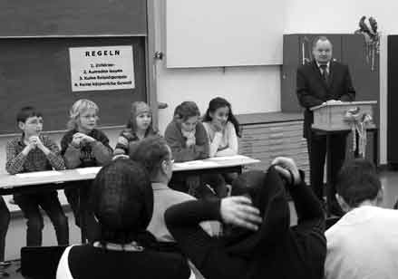 Dieter Hapel, Bezirksstadtrat für Schule, Bildung und Kultur sprach zur Einweihung des Streitschlichtungsraums an der Bobertal-Schule am 22.03.07. Die Ruppin-Grundschule hat gemeinsam mit der Bobertal-Schule in den Herbst- und Winterferien unter der Anleitung von Berthold Pleiß von H.U.G.O. e.V. jeweils 4 SchülerInnen beider Schulen zu Streitschlichtern ausgebildet. Die alte Heizerwohnung wurde mit Unterstützung der Elternschaft als Streitschlichtungsraum hergerichtet. Die Schulen sehen in dem Projekt eine Chance, sich näher zu kommen. Das Projekt ist unter anderem eine Möglichkeit für die Grundschüler, Ängste abzubauen, die gegenüber Hauptschülern der Bobertalschule bestehen. Am 30. Juni soll ein gemeinsames Hoffest gefeiert werden. . |