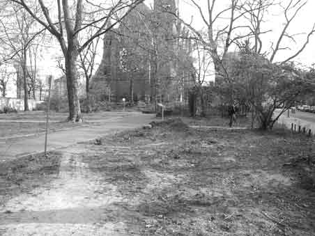 südlichen Teil des Friedrich-Wilhelm-Platzes. Das sieht nach Notverwaltung aus. Die finanziellen Probleme des Bezirkes sind bekannt und damit auch die personellen Engpässe. Trotzdem wollte ich wissen, ob es Planungen für den Platz gibt und welche. Nach Aussage von Bezirksstadtrat Schworck wird eine pflegeleichte und transparente Gestaltung angestrebt. Beete entfallen, kleine Gehölze werden nicht wieder angepflanzt, Rasenflächen erweitert. Ob es wieder Sitzmöglichkeiten im grünen Bereich gibt ist fraglich, da die Vandalismusschäden im ganzen Bezirk so erheblich sind, dass einige Mitarbeiter nur damit befasst sind. Auch der Müll ist ein zunehmendes Problem. Wir sind uns im Gespräch beide einig, mit mehr Aufmerksamkeit und Zivilcourage ließe sich einiges davon vermeiden. Nur nach dem Ordnungsamt zu rufen und nach "1-Euro-Jobbern" ist zu kurz gedacht. Immerhin war ich letzte Woche Augenzeugin