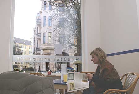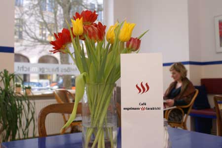Ihr kleines, aber feines kulinarisches Angebot vom Vormittag bis zum frühen Abend bewegt sich zwischen Café, Bistro und Eisdiele im Sommer und orientiert sich an der Friedenauer Kundschaft, die hier tagsüber für einen Snack oder eine Ruhepause vorbeischaut: Das sind häufig Mütter mit ihren Kindern, aber auch Gewerbetreibende der Umgebung: Für die vegetarischen Tagessuppen, wie auch die Kuchen werden die Zutaten aus dem Biogroßhandel geliefert oder täglich frisch im Bioladen gekauft. Kichererbsen-, Möhren-, Linsen-, Kürbis- und die klassische Kartoffelsuppe wurden schon gut angenommen, ebenso die Kuchen: Bienenstich, Apfel-, Käse- und Zupfkuchen. Die Rezepte sind selbst gesammelt, werden ständig erweitert, auch durch Kundenwünsche und Vorschläge. So wird regelmäßig das Kuchen-Rezept des Monats prämiert. Auch die Getränkekarte lohnt den genauen Blick: Die Kaffeesorten kommen je nach Zubereitungsart von einer kleinen Neuköllner Rösterei, von der italienischen Rösterei Soledor oder sind explizit Biokaffee. Neben Bionade gibt es ‚Fritz-Kola' und ‚Fritz-Limo' (einmalig in Friedenau!) sowie die original italienische ‚Orangina'. - Kindheitserinnerungen werden wach! Das zweite Standbein, Kultur für Kinder und Erwachsene, entwickelt sich allmählich: ‚Die Fühler werden ausgestreckt', meint Frank Engelmann. Geplant sind Lesungen, weitere Ausstellungen und kleine Konzerte. Passend zur eigenen privaten Situation - denn inzwischen wird Familiennachwuchs erwartet - begannen Munia und Frank zunächst mit ‚Kultur für die Kleinsten'. Jeden ersten Montag im Monat liest eine ‚Märchenoma' Geschichten für Kinder ab 3 Jahren. Astrid Lindgren und Klassiker, wie ‚Peter und der Wolf', haben die Kids schon zu hören bekommen. Die nächste Märchenoma-Lesestunde ist Mo 7. April ab 16 Uhr. Und zum Vormerken: Am Montag, 28. April um 16 Uhr spielt das Puppentheater Katinchen‚ Wusel und das rote Geheimnis', eine Geschichte über Freundschaft für Kinder von 3 - 80 Jahren. Die Puppenspielerin Katharina Kröner und die Kunstpädagogin Tine Lechner spielen ein eigenes Stück mit selbst gebauten Marionetten und Tierfiguren. Was wünschen sich Munia Tarabichi und Frank Engelmann, was würden sie gern erreichen? Die Antwort kommt spontan: Die Friedenauer Tradition der Literaturcafés wieder aufleben lassen, vom kulinarischen Kiez-Café zum kulturellen Treffpunkt werden: Friedenau ist der ideale Ort hierfür! In nächster Zukunft wird erst mal sehnlich der Sommer erwartet, damit die Eiscafé-Saison beginnen kann. Dann wird sich der Bürgersteig vor dem Café mit Tischen, Stühlen, Schirmen und hoffentlich vielen Eis- und Sonnenhungrigen füllen ! Das Café Engelmann-Tarabichi, Wiesbadener