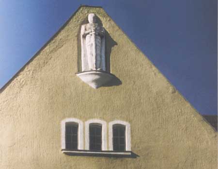 schaut er vom lindgrünen Giebel des Hauses Nr. 76 auf die bekannte