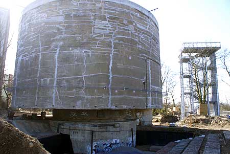 ![]() Zylindrischer Klotz an der Kolonnenbrücke. Das Bauwerk „T“. Foto: Thomas Protz Fast rätselhafter als Stonehenge Groß- oder Schwerbelastungskörper, so wird der zylindrische Betonklotz an der Kolonnenbrücke bezeichnet. Was, Sie haben ihn noch nie bemerkt? Dann sehen Sie mal beim Passieren der Brücke in Richtung General-Pape-Straße oder bei einer Fahrt mit der „S 2“ zum Potsdamer Platz nach dem Bahnhof Südkreuz nach rechts oben. „Welthauptstadt Germania“ und das Bauwerk „T“ Vor siebzig Jahren hatte die Planung für die Neugestaltung Berlins als Welthauptstadt „Germania“, die hauptsächlich vom Generalbauinspektor (GBI) für die Reichshauptstadt Berlin, Albert Speer, und Adolf Hitler selbst durchgeführt wurde, ihren Höhepunkt erreicht: Die Festlegung einer Nord-Süd-Achse war längst beschlossene Sache, mit begehbaren Modellen ging man ins Detail. Zurzeit ist die Planung einschließlich der Modelle in der Ausstellung „Mythos Germania“ zu sehen, veranstaltet von „Berliner Unterwelten e. V.“ Im Süden sollte die Achse ihren vorläufigen Abschluss in Schöneberg finden. Ältere Bewohner erinnern sich noch an die vorbereitenden Abrissarbeiten. Dass der geplante Südbahnhof (Bombastisch! Mit Kanonen geschmückt!) ungefähr an der Stelle errichtet werden sollte, wo sich heute unser Bahnhof Südkreuz befindet, sei am Rande erwähnt. Ein Bauwerk jedoch sollte, kurz vor ihrem Ende, den Höhepunkt der Achse bilden: Der Triumphbogen! Das gewaltige Bauwerk, gedacht als Ehrenmal für die Toten des Ersten Weltkrieges, sollte 117 m hoch werden und ähnlich aussehen wie sein Pariser Vorbild, der Arc de Triomphe, den Napoleon errichten ließ und der „nur“ 50 m hoch ist. Hitler freute sich zu seinem 50. Geburtstag über ein 4 m hohes, begehbares Modell des Bogens, zu dem er selbst (!) schon um 1925 herum (!) die ersten Entwürfe skizziert hatte. Technisch-wissenschaftliche Untersuchung des Baugrundes: Dass die Tragfähigkeit des Baugrundes ein nicht zu vernachlässigendes Thema beim Planungsprozess ist, haben die jüngsten Ereignisse in Köln auf schreckliche Art und Weise wieder in Erinnerung gerufen. Und hier sollte nun eine Planung umgesetzt werden, bei der bisher nie Gebautes verwirklicht werden sollte. Eine genaue Untersuchung des Baugrundes wurde verlangt. Von unerforschten Mergelschichten ist die Rede. Na, der Berliner Boden ist immer für eine Überraschung gut: Seit Schinkels Zeiten und zuletzt bei den Regierungsbauten wurde über „unverhofft“ auftretendes und eindringendes Grundwasser rechts und links der Spree geklagt. Die Degebo (Deutsche Gesellschaft für Bodenmechanik), 1928 gegründet, wurde in die Arbeiten eingebunden und sollte die Bodenverhältnisse erforschen. Unter ihrer Regie wurden im Bereich Teufelsberg und vor dem Reichstag durch Grabungen und Bohrungen Proben des Baugrunds entnommen. Aber das größte Untersuchungsfeld wurde zur Vorbereitung für die Errichtung des Triumphbogens angelegt. Der Bau des Schwerbelastungskörpers Fa. Dyckerhoff & Widmann wurde 1941 beauftragt, für rund 400.000 Reichsmark einen „Großbelastungskörper“ herzustellen, französische Zwangsarbeiter mussten die Ausführung übernehmen. Es war eine Versuchsanordnung wie für Goliath im ersten Semester Geologie: Ein gewaltiger Betonzylinder sollte den märkischen Sand mal ordentlich pressen. Die sichtbare Höhe beträgt 14-15, der Durchmesser 21 Meter. Doch eigentlich ist es kein Zylinder, sondern mehr ein überdimensionierter Sektkorken. Die genannten Maße betreffen nur den Kopf des Gebildes, darunter geht es 18 Meter tief mit einem Durchmesser von 11 Metern in die groben Schichten der Teltow-Hochebene. Da frage ich mich doch: War so ein Realversuch war beim damaligen Stand von Wissenschaft und Technik unbedingt nötig? Die Gründung eines 117 Meter hohen Bauwerks ist schwierig, aber schließlich standen zu jener Zeit schon einige Hochhäuser. Oder war die ganze Aktion eine subtile Methode der am Bau Beteiligten, den Größenwahn zu stoppen oder zumindest zu verzögern? Und wenn es doch nötig war: Warum steht der Schwerbelastungskörper nicht im Bereich der geplanten „Halle des Volkes“? Die Halle hätte in ihrer Struktur nicht wesentlich verändert werden können und sollte den direkten Bezug zum Reichstag haben, während man sich bei einem Triumphbogen auch eine materialmäßig abgespeckte und damit leichtere Version hätte vorstellen könnte. Hinzu kommt, dass der Standort des geplanten Triumphbogens keinerlei Bezug zur vorhandenen Stadtstruktur hatte. Ungewöhnlich in jenen Zeiten, als man für ideologische Begründungen alle möglichen Mythen und Überlieferungen im wahrsten Sinne des Wortes ausgegraben hatte... 12.650 Tonnen wiegt der Großbelastungskörper, so ein „Korken“ springt nicht mehr von alleine weg. Sprengen ging auch nicht nach dem Krieg, schon gar nicht wegen der benachbarten Wohngebäuden. 1948 wurde das Experiment mit dem Ergebnis abgeschlossen, dass die vorhandene Setzung viermal so hoch wie die zulässige war. Nutzung bis heute: Für Forschungszwecke wurde er noch bis in die 1970er Jahre genutzt. Seit 1995 genießt der Koloss Denkmalschutz und soll im Rahmen des neueröffneten Geschichtsparcours als anfassbares Relikt an die Planungen im Dritten Reich erinnern. Meines Erachtens ist dies zu begrüßen, denn hier wird deutlich, was Bauen in einer Diktatur -auch wenn sie weniger brutal ausgeformt gewesen wäre als damals- bedeutet: Ein Städtebau, in dem das Individuum nichts, die „Massen“ (=als Synonym für viel Menschen!) alles bedeuten. Zurzeit sind die Restaurierungsarbeiten am Großbelastungskörper, die im vergangenen Jahr durchgeführt wurden, abgeschlossen. Auf dem Grundstück entsteht jetzt ein Ort der Information mit Aussichtsplattform und angeschlossenem Seminarraum. Als Fertigstellungs- und Einweihungstermin ist der „Tag des Offenen Denkmals“ im Herbst vorgesehen. Der schon erwähnte Verein „Berliner Unterwe