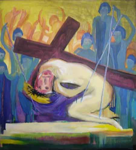 ![]() Station 3: Jesus fällt zum ersten Mal unter dem Kreuz - Bildnis von Kurt Hammer Der vierzehnfache Blick auf den Punkt Am 1. Fastensonntag eröffnete Pfarrer Wenzel in der Kirche „Zum Guten Hirten“ am Friedrich-Wilhelm-Platz die Ausstellung einer Künstlergruppe vom bayerischen Ammersee, die sich an den überlieferten Formen des Kreuzweg-Gedenkens orientiert. Wie er in seiner Ansprache erläuterte, setzen die 14 Künstler der Gruppe die Geschehnisse an den 14 Stationen des Leidensweges in Beziehung zu ihrem eigenen Erleben, wobei jeder von ihnen „sein“ Stationsthema ausgewählt hat. Wer also die zwei Meter hohen Stationsbilder an den Längsseiten der Kirche entlanggeht, erlebt vierzehn persönliche Sichtachsen. Am Beginn steht das Todesurteil. Es folgen die Kreuzaufnahme, der dreifache Sturz unter der Last, die Begegnung mit Maria, mit der hilfreichen Veronika, dem mittragenden Simon sowie den weinenden Frauen. Schließlich folgen die Aufteilung der Kleider, die Kreuzigung, der Tod sowie die Abnahme und Grablegung. Die formalen Mittel der Darstellung reichen von der fast naiven und gefühlvollen Sprache über realistisch-figürliche Wiedergaben bis zu expressionistisch-surrealen Formen und der Reduktion auf grafische Elemente. Silvia Stein hat sogar eine textile Abstraktion versucht, die allerdings ihre ganz eigene Herausforderung hervorgerufen hat. Beim Aufhängen des Kunstwerks war das Untere zum Oberen geraten, was aber leicht zu verstehen ist. Denn eine einfarbig gesteigerte Betonung einer Verbandszeugreihung kann logischerweise mit dem Schwerpunkt oben oder unten gesehen werden, je nachdem der Hauptgedanke auf „Fall“ oder „Auferstehung“ gerichtet werden soll. Durch die Anwesenheit der Künstler ergab sich die Gelegenheit zu erläuterndem Gespräch. So erklärte Kurt Bergmeier seinen surrealistisch mit maskenpuppenartigen Spöttern umstandenen „Sturz, zum dritten Mal“ mit dem Hinweis, er sei im Hauptberuf Architekt und habe hier sowohl in der Form als auch im Inhalt mit großer Freude das Millimeterkorrekte seiner beruflichen Arbeit verlassen, um sich an der Frage auszutoben: „Sind wir nicht alle schon mal gefallen? Hin- oder durch-, rein- oder aus-“? Der hauptberufliche Soziologe Georg Filser dagegen bewahrte sich auch in seiner Bildgestaltung den sozialempirischen Blick: Draußen vor der Wolkenkratzerstadt ist ein schemenhafter Mensch mit ausgebreiteten Armen im Aufschwung an ein Kreuz zu sehen, dessen Zeitungsbeschichtung die Sensationsgier von Medien und Menschen anklagt. Eingerahmt war diese gedankenreiche Eröffnungsveranstaltung von musikalischen Darbietungen an Orgel, Cello und Querflöte. Die Entsetzensschreie in den sechs Solostücken für Flöte von Hindemith waren der deutliche Hinweis an die gebannten Zuhörer, dass auch die Musiker ihre Gedanken auf den Kreuzweg gerichtet hatten. Die Ausstellung ist noch bis zum 26. April geöffnet und kann zu den folgenden Zeiten besichtigt werden: Mo 18-20 h, Di-Do: 18 -21.30 h, Fr 15-17 h und 18-20 h, Sa 14-16 h, So 13-15 h, sowie zu den Gottesdienstterminen. Ottmar Fischer . |
