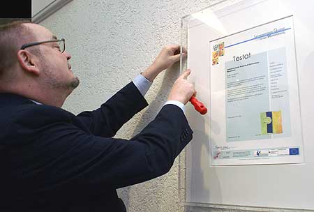 Bezirksstadtrat Dieter Hapel montiert das Qualitäts-Testat. Foto: Protz