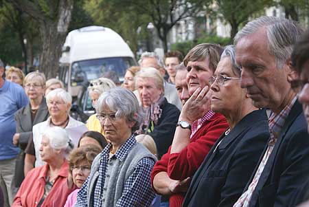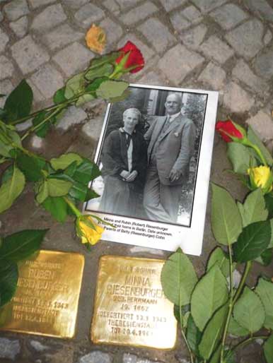 ![]() Bewohnerinnen und Bewohner der Stierstraße und aus der Nachbarschaft in stillem Gedenken. Foto: Thomas Protz Das Gedächtnis einer Straße Die Ausstellung „Wir waren Nachbarn“ im Rathaus Schöneberg war für einige von uns der Anlass, unsere Gruppe zu gründen, denn hier stießen wir erstmals im Frühjahr 2005 auf zahlreiche Namen von Deportierten aus der Stierstraße. Viele der Deportierten haben auf dem Gelände gelebt, auf dem sich heute die Kirche und das Gemeindehaus der Philippusgemeinde befinden, also in der Stierstraße 17 bis 19. Am Israelsonntag im August 2005 fand in der Philippuskirche ein gemeinsamer Gottesdienst mit Rabbiner Nachama statt. Beim anschließenden Gespräch erzählte Lisa Reineke von den drei Stolpersteinen, die sie einige Wochen vorher in Eigeninitiative vor der Nr. 3 hatte legen lassen. Wir beschlossen, eine Initiativgruppe für Stolpersteine für die Deportierten aus der Stierstraße Nr. 18/ 19 (Philippusgemeinde) zu gründen, die dann im März 2006 zum ersten Mal zusammenkam, sich aber nicht nur aus Gemeindemitgliedern zusammensetzte. Die Gruppe umfasste etwa 12 Personen, was auch heute noch so ist, auch wenn im Laufe der Zeit manche ausschieden, neue hinzukamen. Unsere Arbeit begann mit Recherchen zu den Namen von Juden, die in der Stierstraße 17-19 gelebt hatten und als deportiert galten. Wir forschten einzeln oder in kleinen Gruppen in den verschiedenen Archiven. Nach einigen Monaten Arbeit entschieden wir uns, die Ergebnisse in einer Broschüre zusammenzufassen und zu einer Informationsveranstaltung einzuladen. Diese fand im Juli 2007 im großen Saal im Gemeindehaus statt und war ein großer Erfolg. Ebenfalls im Juli 2007 wurden 2 Steine vor der Stierstraße Nr. 15 verlegt. 16 weitere Steine wurden im Juli 2008 vor der Philippuskirche gelegt, sowie 2 Steine vor dem Haus Nr.16. (Hier übernahm die Schule am Perelsplatz die Patenschaft und gestaltete auch die Einweihung.) Nach der Informationsveranstaltung und der Fertigstellung der Broschüre im Jahr 2007 beschlossen wir, auch für die Deportierten aus der Stierstraße Nr. 20/21 Stolpersteine zu legen und begannen mit den Recherchen. Die Verlegung der 16 Stolpersteine vor der Stierstraße 4, 20 und 21 fand am 21. September 2009 statt. Für 39 Menschen liegen nun in der Stierstraße in Friedenau Stolpersteine. Wir haben viel über die Lebenswege und Schicksale der Opfer erfahren. Unsere intensiven Nachforschungen ergaben gleichfalls Kontakte mit Verwandten und Nachkommen der Deportierten und Ermordeten, die meistens mit Zustimmung und Unterstützung auf unsere Arbeit und die Stein-Verlegungen reagierten. Mit vielen korrespondieren wir oder haben sogar persönlichen Kontakt. So zum Beispiel mit Angehörigen des Ehepaars Minna und Ruben Riesenburger aus Israel und USA, die eines unserer Mitglieder persönlich im Frühling 2009 kennen lernen durfte. ![]() Stolpersteine für Minna und Ruben Riesenburger. Foto: Thomas Protz Ruben und Minna Riesenburger und Tochter Betty Ruben (eigentlich: Robert) Riesenburger, geboren am 17.7.1873, war im Ersten Weltkrieg ein hoch dekorierter Pilot. Er war so berühmt, dass es Sammelbilder mit seinem Bild gab. Er stammte aus Briesen, wo er ein großes Tabakgeschäft betrieb. Das Ehepaar Ruben und Minna Riesenburger (geb. 2.2.1862) zog mit der 1904 geborenen Tochter Betty vermutlich Anfang der zwanziger Jahre nach Berlin-Lichtenberg und 1935 nach Wilmersdorf (in die Rauenthalerstr.). 1936 und 1937 hatten sie ein Tabakgeschäft in der Stierstraße Nr.22, ab 1939 waren sie gemeldet in der Nr.20. (Vermutlich war das Geschäft in der Pogromnacht im November 1938 zerstört worden und zwar dort, wo sich zur Zeit eine Gardinen- und Polsterwerkstatt befindet.) Das Ehepaar musste - vermutlich 1940, nachdem den Juden 1939 der Mieterschutz aberkannt wurde - zur Untermiete in die Stierstraße 21, Seitenflügel, dritte Etage - zum Ehepaar Irmgard und Georg Krayn ziehen. Ruben und Minna Riesenburger wurden im Januar 1943 im Alter von 69 bzw. 80 Jahren nach Theresienstadt deportiert. Dort ist Minna Riesenburger im April 1943, Ruben Riesenburger ein Jahr später im April 1944 umgekommen. Die Tochter Betty war zur Zeit der Deportation ihrer Eltern mit Alfred Oppenheim verheiratet. Betty und Alfred emigrierten 1938 oder 1939 nach Shanghai. Bettys zweiter Mann, Berthold (Bert) Cohn stammte aus Nordhausen im Harz. Er wurde in der „Kristallnacht“ 1938 verhaftet und nach Buchenwald gebracht, von wo er im November wieder entlassen wurde mit der Auflage, Deutschland sofort zu verlassen. Per Schiff fuhr er via Suez Kanal nach Shanghai, wo er bis 1947 blieb. Sein Bruder Heinz hatte Deutschland bereits 1933 verlassen und lebte in Palästina. Seine Schwester Lotte war ebenfalls nach Shanghai geflohen und ging mit ihrem Mann, Hans Schwarz, 1948 in die USA. Berthold Cohn arbeitete in der Amerikanischen Armee, die die Chinesen gegen die japanische Armee, die China angegriffen hatte, unterstützte, sowie in einem Vertriebenen-Camp. Dort lernte er Betty und ihren Mann Alfred Oppenheim, der sehr krank war, kennen. Nach dem Tod von Alfred Oppenheim heirateten Betty und Bert am 18. August 1946. Im Februar 1947 wurde Betty schwanger. Sie wünschten sich sehr, dass das Kind amerikanischer Staatsbürger würde, weshalb sie sich kurzfristig nach USA einschifften. Wegen eines Taifuns landete das Schiff jedoch in Hawaii, wo es den Sturm abwarten sollte. Betty und Bert wurde angeboten, das Schiff zu verlassen, doch da Hawaii damals noch kein US-Staat war, lehnten sie das Angebot ab. So landete das Schiff am 31. Oktober 1947 in San Francisco. Betty wurde sofort ins Mount Zion-Hospital gebracht, wo 7 Stunden später, am 1. November, ihr Sohn Robert George Cohn, geboren wurde. Da sehr viele jüdische Flüchtlinge in San Francisco gelandet waren, konnten sie dort nicht alle untergebracht werden. Man bot den Flüchtlingen verschiedene Orte an, unter anderem Kansas City, Missouri. Betty und Bert entschieden si