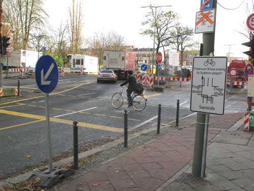 ![]() „Radwegumleitung“ Foto: Hartmut Ulrich Sanierung der Friedenauer Brücke Auf kluger, weitsichtiger und umfassender Planung beruhend, haben in diesem Oktober die Sanierungsarbeiten auf der Friedenauer Brücke begonnen. Ende Oktober 2011 sollen die Arbeiten beendet sein. Dann soll die Brücke in neuem Glanz erstrahlen, was vor allem heißt: Erneuerung der gesamten Tragkonstruktion, neuer Straßenbelag, neu gestaltete Lichtzeichenanlagen, Neugestaltung der Wege für alle Autofahrer, Radfahrer und Fußgänger zur Verbesserung der Verkehrssicherheit, Abbruch der alten Treppenhäuser, die damals als Zugänge zu den Autobahnbushaltestellen dienten und ewig funktionslos waren. (Auszug aus der Pressemitteilung der Senatsentwicklung für Stadtentwicklung vom 23.09.2010). Die Beeinträchtigungen für Verkehrsteilnehmer und Anwohner scheinen nach ersten Beobachtungen erträglich zu sein. Nachfragen können an die Senatsverwaltung für Stadtentwicklung unter 90139-3772 gerichtet werden. Lediglich die geistigen Anforderungen für die Radfahrer und Fußgänger beim Überqueren der Brücke werden auf die Probe gestellt (siehe Fotos). Aber so ist eben Friedenau: Mit Klugheit, Weisheit und Voraussicht werden auch für die Zeit der Brückenarbeiten diese Hürden gemeistert. Gutes Gelingen und gute Bedingungen für die Arbeiten wünscht schon jetzt der Brückenschauer Hartmut Ulrich P.S. Und wer jetzt noch etwa meckern sollte, erinnere sich bitte an die Meldung im Friedenauer Lokal – Anzeiger aus dem Jahr 1910: „ Notruf aus der Fregestraße: … so drängt sich die ganze Masse der Stein-, Mörtel-, Sandwagen durch die gepflasterte Fregestraße ……. Jetzt ist der Straßenlärm so groß, dass man beinahe kein Fenster mehr öffnen kann und sein eigenes Wort im Zimmer nicht mehr versteht.“ Dezember 2010 Stadtteilzeitung < Inhaltsverzeichnis |