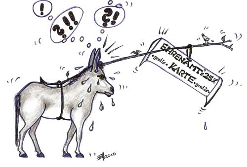![]() Es lockt die Ehrenamtskarte?? Zeichnung von Elfie Hartmann „Anerkennungskultur“ nach Gutsherrenart In Bezug auf Aufwandsentschädigungen unterscheiden sich Ehrenämter sehr. Während Übungsdienstleiter in Sportvereinen relativ gut und Bezirksverordnete recht komfortabel entschädigt werden, erwartet man von vielen anderen ehrenamtlich Tätigen selbstverständlich, dass sie ihre Aufwendungen aus eigener Tasche zahlen. Besonders die über 60jährigen, die sich – gemessen an allen Altersgruppen - überproportional engagieren, gehen oft leer aus. Zurzeit entwickelt die Senatskanzlei III im Roten Rathaus eine „Ehrenamtskarte für Berlin“, die nach dem Vorbild anderer Bundesländer einige Vorteile gewähren soll. Weil das nichts kosten darf, ist zum Beispiel an Rabatte gedacht, die Freizeit- und Kultureinrichtungen auf Eintrittspreise gewähren. Es gibt 850.000 ehrenamtliche Mitarbeiter in Berlin, ohne die – das wird man nicht müde zu betonen - „unser Gemeinwesen zusammenbrechen würde“. Aber es sollen jedes Jahr nur 3.000 die Karte erhalten. Obwohl man die Latte für die Berechtigung sehr hoch legt (siehe Schaukasten) erfüllen die Vorgaben weit mehr als 3.000 Personen Institutionen und Verbände können daher unter ihren langjährig Tätigen nur wenige Empfänger auswählen und müssen die leer ausgehenden Enttäuschten vertrösten auf das Jahr 2012, 2013 oder auf den Sankt Nimmerleinstag. Das ist so gewollt und wird uns stolz als die vom Senat entwickelte „neue Anerkennungskultur“ präsentiert. Dort hat man wohl eine etwas betuliche Vorstellung von den Menschen, die unentgeltlich für unser Gemeinwesen arbeiten und ist überzeugt, dass die Empfänger der Karte mit dankbarer Freude auf so viel Anerkennung reagieren werden. Und die Übrigen sich noch mehr ins Zeug legen, um auch einmal von der Anerkennungskultur erfasst zu werden. Inzwischen dürfen sie ihre Aufwendungen wie Fahrgeld und Parkgebühren weiter selbst zahlen. Das wird sich in Zukunft auch nicht ändern, erklärt mir Frau Rebecca Drusche von der Senatskanzlei III auf Rückfrage. Schließlich brauche der Senat das Geld, auch das, welches die Ehrenamtlichen für die Zeit ihrer Tätigkeit in die Parkuhren der Bezirke stecken müssen. Also auch das vieler bürgerschaftlich Engagierter mit kleinen Renten. Ich verzichte hiermit schon mal öffentlich auf Ehrung und Karte. Und auf die ganze neue Anerkennungskultur. Und hoffe, niemand lässt sich bei so viel Anerkennungsgeiz die Freude an seinem Ehrenamt nehmen. Renate Birkenstock . |