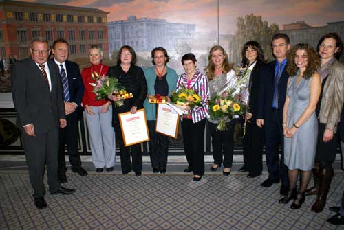 ![]() Foto: Thomas Protz Al Nadi erhält Kosmopolita 2010 Das Projekt Al Nadi, für arabisch-sprachige Mädchen und Frauen, vom Nachbarschaftsheim Schöneberg erhielt den diesjährigen Preis. Tamara Siebenmorgen-Koch, Hannah Drexel, Rita Süssmuth und Lina Ganama Am Mittwoch, 22. September verliehen Bezirksbürgermeister Ekkehard Band und die Integra-tionsbeauftragte des Bezirks Ga-briele Gün Tank gemeinsam mit METROPOL FM den Interkulturellen Preis für Frauen und Mädchen „KOSMOPOLITA“. Mit der "Kosmopolita" würdigen die Veranstalter die Leistungen von Frauen und Mädchen, Gruppen oder Organisationen, die sich im Bezirk Tempelhof-Schöneberg herausragend und beispielgebend für das interkulturelle Leben einsetzen. Nach der Begrüßung der geladenen Gäste durch den Bezirksbürgermeister Ekkehard Band hielt die Schirmherrin Prof. Dr. Rita Süssmuth, Bundestagspräsidentin a.D. eine Laudatio für die Verdienste von Al Nadi. „Dieses Projekt schafft genau die Vorraussetzungen, die eine Frau oder ein Mädchen braucht, um sich in Deutschland zurechtzufinden. Al Nadi nimmt die Frauen ernst. Nur wenn man den Frauen und Mädchen mit Verständnis und Respekt begegnet, wird eine Atmosphäre geschäffen, in der sich Integration und Zugehörigkeitsgefühle entwickeln können“, erklärt Rita Süssmuth in ihrer mitreissenden Rede. Gemeinsam mit dem Bürgermeister überreichte sie anschließend die Kosmopolita an die Leiterinnen des preisgekrönten Projektes Lina Ganama und Hannah Drexel. Da sich die Jury für einen zusätzlichen Ehrenpreis entschieden hat, gab es an diesem Abend zwei Gewinnerinnen. Den Jury-Ehrenpreis nahm Tamara Siebenmorgen-Koch als Inhaberin des "Cafe Interkulturell" entgegen. Frau Siebenmorgen-Koch hat die Integrationsarbeit über Jahrzehnte in ganz besonderer Weise mit Ihrem außerordentlichen Engagement geprägt. . |