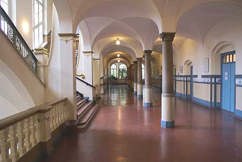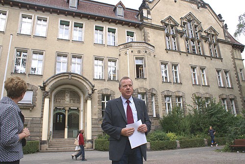 ![]() Schuldirektor Michael Rudolph / Foto: Thomas Protz Perle des Perelsplatzes Es ist eine eklektizistische Attraktion: Das Bauwerk der Friedrich-Bergius-Oberschule. Nur zu jener Zeit des wilhelminischen Späthistorismus, in der es errichtet wurde, war seine Außen- und Innengestaltung nicht ungewöhnlich. Schuldirektor Michael Rudolph führt durch die Friedrich-Bergius-Oberschule ![]() Interieur der Schule/ Foto: Thomas Protz Danach folgten mehrere magere sowie fette Jahre dieser Stadt, in denen diese das Vernichten und Ersetzen unzähliger stattlicher Bauten erleben musste. Der Schulbau an der Handjerystraße hat all diese Jahre überdauert, über 100 Jahre lang. Und so ist das einstige Friedenauer Gymnasium die Perle in der „Auster“ Perelsplatz geblieben. Das Gebäude wurde zwischen 1901 und 1902 unter der Leitung der Architekten Paul Engelmann und Erich Blunck (1872–1950) errichtet. Der L-förmige Grundriss des Bauwerks wird von einem integrierten, mit dem Wappenrelief Friedenaus geschmückten Kastenturm bestimmt. Er sitzt im Gelenk des „L“ und verbindet den horizontalen und vertikalen Gebäudeflügel. Dieser mit Ecksteinen verzierte Turm, mit seinen vier Schweifgiebeln, kombiniert die typischen Elemente der Neoromantik und –gotik mit denen des Neobarocks. Er beherbergt ein Glockentonuhrwerk; zwei seiner Giebel sind mit je einem Zifferblatt versehen. Aus drei primären Aufschwungswinkeln der Giebel sprosst ein Pinakel. Inmitten des Giebelgeschosses nistet ein mit Ziegelsteinen überdachter Dachreiter, der noch heute als Aus-sichtskuppel dient. Auch die Mansardendecken über den beiden Gebäudeflügeln beziehen sich auf die Neoromantik. Die Fassade des Haupteingangsflügels ist durch eine Risalit-Fensteranlage und ein Säulenportal charakterisiert; hier werden Bauelemente ersichtlich, die dem Neobarock zugeordnet werden können. Während die Fenstergewänder im Eingangsgeschoss mit burgenbauartigen Steinquadern versehen sind, sind sie im Dachgeschoss mit Bekrönungen, die den deutschen Heimatstil veranschaulichen, überwölbt. Die in den Tympanon-Türbogen und in den mit Fries dekorierten Risalit-Balkon eingemeißelten lateinischen und deutschsprachigen Schriftzüge (z.B. salus scholae salus civitatis und wie die Saat so die Ernte) und die symbolbeladenen Reliefs (Flora sowie Fauna) weisen konkret auf eine gestalterische Vorliebe der Jugendstilepoche. Auch im Inneren zeigt der Schulbau seine architektonische Vielseitigkeit. So ist das Haus mit kunstvollen Plinthe-Balustraden, die die Haupttreppenräume begleiten, ausgestattet. Die Handläufe sind mit schmiedeeisernen Geländerführungen im Laubfries-Stil verziert. Die Decken sind kreuzgewölbt; diese, je nach Etage, werden durch Granit- oder Sandsteinpfeiler getragen. Funktionalität im Inneren hatte neben Formschönheit und Opulenz, bei den beiden Architekten hohe Priorität. Deshalb wurde ein „L“-förmiger Grundriss gewählt: die Schuladministration konnte aus dem Winkel des „L“ auf jeder Etage gut Aufsicht halten. Das Erdgeschoss sowie die zwei daraufsitzenden Etagen sind zudem farbkodiert; die Farb-akzente an Fliesen und Wandleisten sind, von unten nach oben, Grün, Blau und Gelb. Am Ende des Fußes des „L“ befindet sich eine Aula, die im Zweiten Weltkrieg ausbrannte. Bei ihrer Wiederherstellung in den 1950er Jahren spielten die Formen der Nachkriegsmoderne, mit ihren Geradlinigkeiten, eine starke Rolle. So rundet die Aula – auch wenn so nicht von den ursprünglichen Architekten anvisiert – den Stilpluralismus des Baus ab und führt ihn gleichzeitig zur Gegenwart. Am 18. April 1903 wurde die Schule, die zu jener Zeit Gymnasium Friedenau hieß, eingeweiht. Heute ist sie nach einem deutschen Chemiker der Ersatzrohstoffforschung benannt. Anfänglich trug auch das umgebende Parkareal, das 1907 angelegt wurde, einen anderen Namen, nämlich Maybachplatz, nach einem preußischen Politiker, der in den Adelsstand erhoben wurde. Der jetzige Platzname erinnert an einen ehemaligen Gymnasiasten der Oberschule, Friedrich Justus Leopold Perels (1910-45). Als Mitglied der Bekennenden Kirche leistete Perels Widerstand gegen den NS-Staat; wenige Tage vor Kriegsende wurde er durch ein Sonderkommando des Reichssicherheitshauptamts hingerichtet. Weitere Persönlichkeiten, die die Schule im Laufe ihres Lebens besucht haben, sind die Politiker Peter Lorenz und Egon Bahr, sowie die Schauspielerin Hildegard Knef und der Theaterkritiker Friedrich Luft. Die jetzige Oberschule wird seit 2005 von Michael Rudolph geleitet. Ihm liegt die Pflege der Geschichte des Baus sehr am Herzen. Er führte am Tag des offenen Denkmals durch seine Schule. Erzählfreudig präsentiert Direktor Rudolph seine Schule von außen und innen; interessant und unterhaltsam sind die Geschichten, die er vorträgt. Besonders stolz ist Michael Rudolph auf das neuerrichtete Schulmuseum mit seinen Ausstellungsstücken aus den letzten elf Dekaden, sowie auf die Andenken, die von der Geschichte der Schule erzählen. Diese, neben dem Bau selbst, begeisterten auch die etwa 50 Teilnehmer des etwa einstündigen Rundgangs an dem sonnigen Sonntag des Tages der offenen Tür. T. W. Donohoe www.friedrich-bergius-schule . |